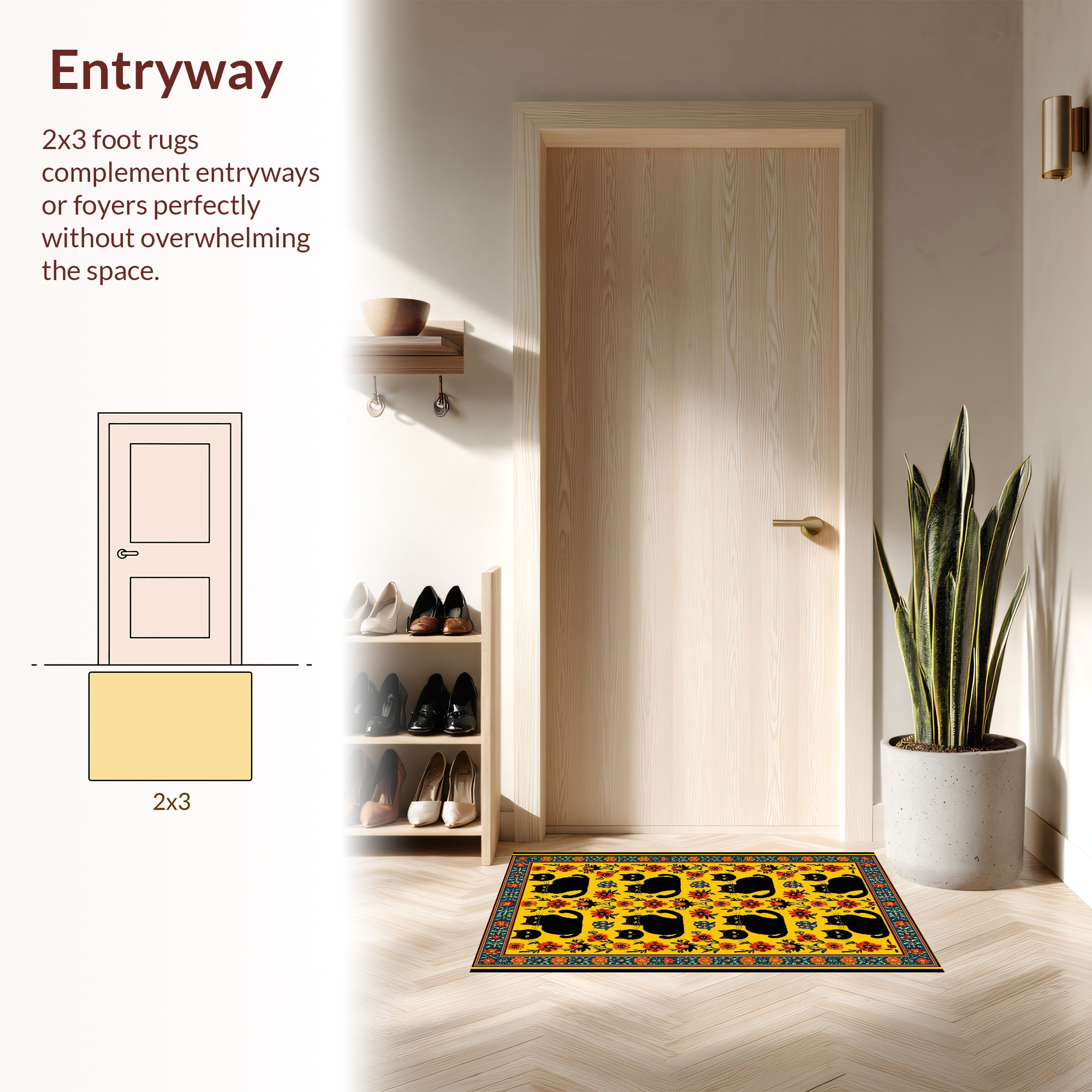 Cheerful Yellow Cat & Floral Whimsical Rug