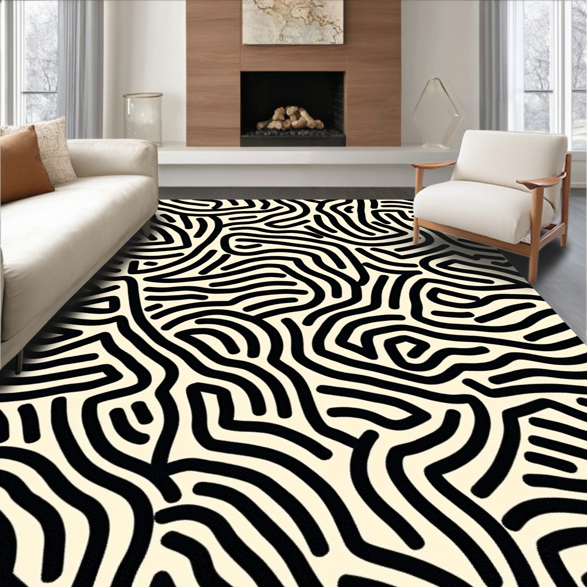 Cream Black Abstract Wave Modern Rug