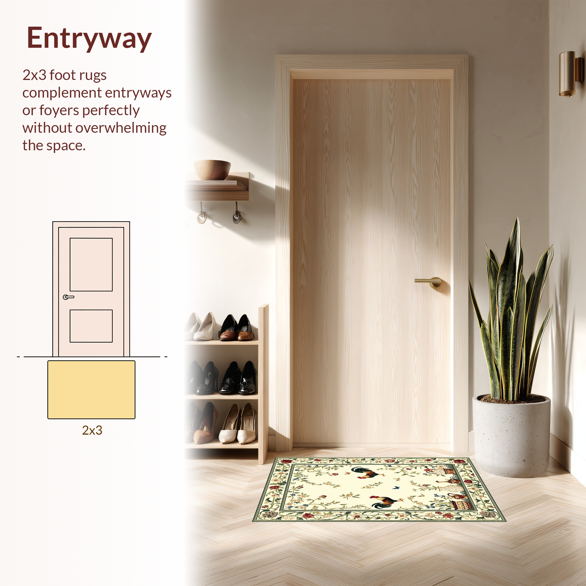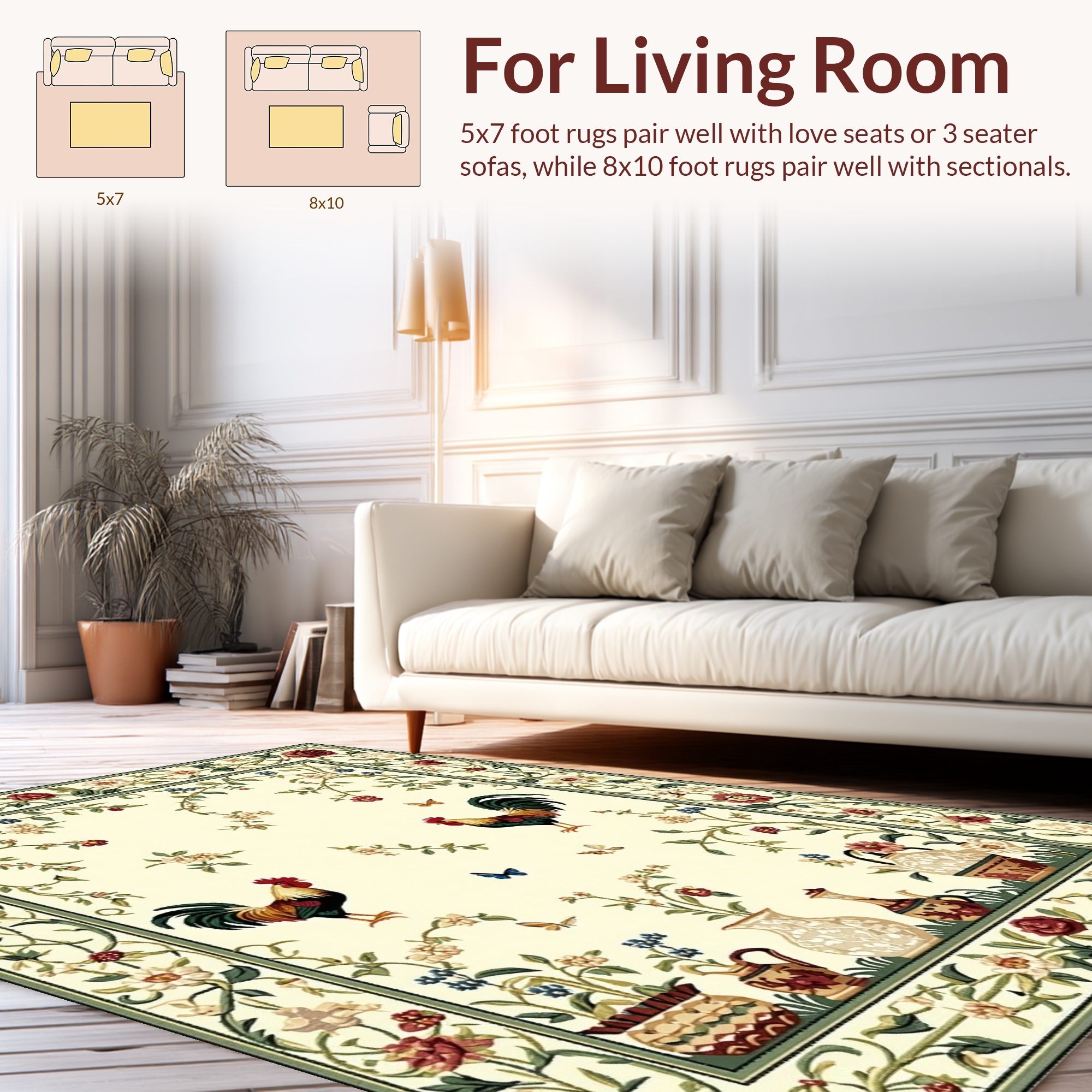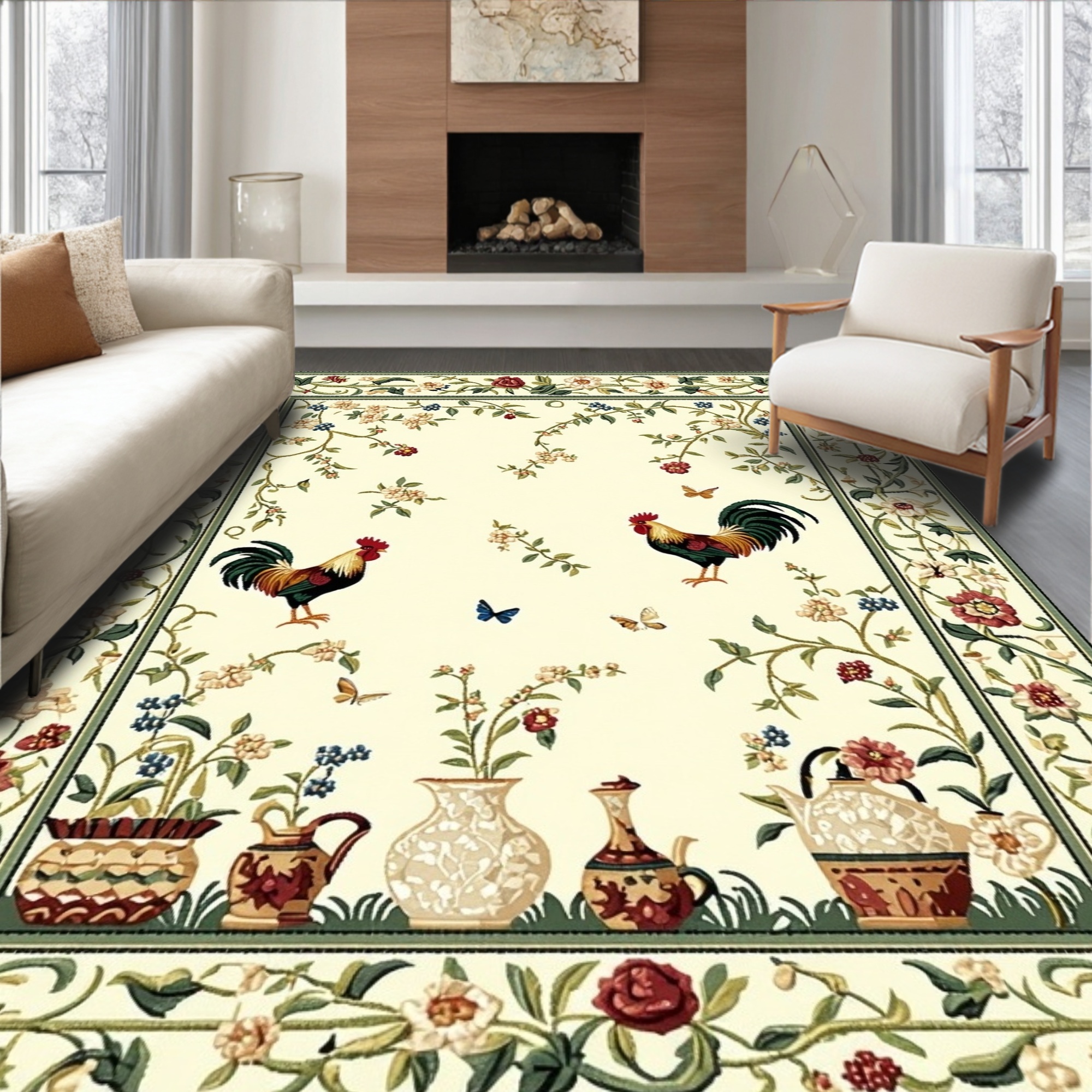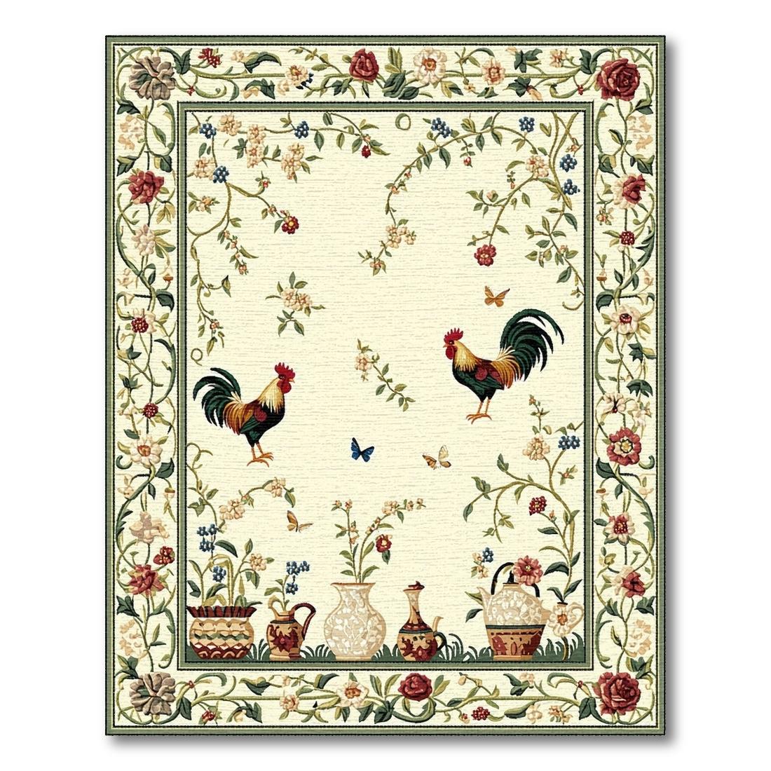 Cream Rooster Floral Pastoral Rug