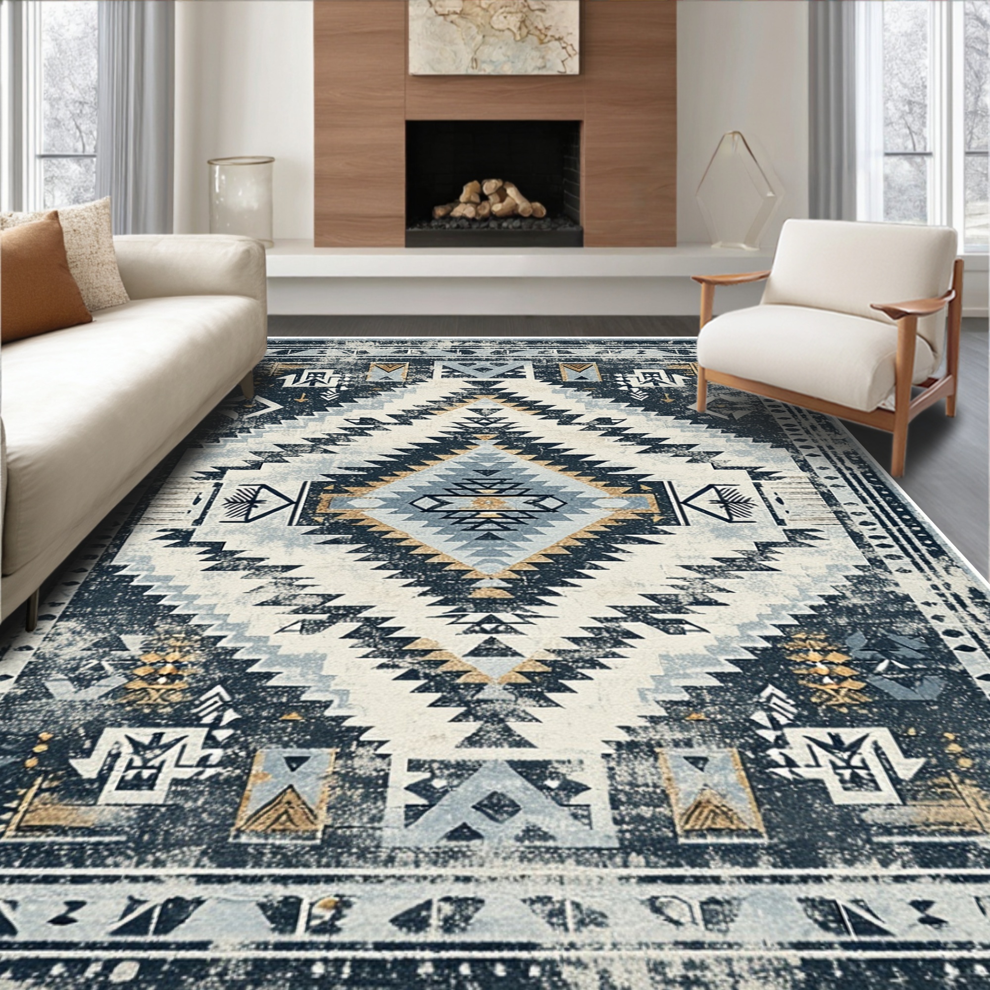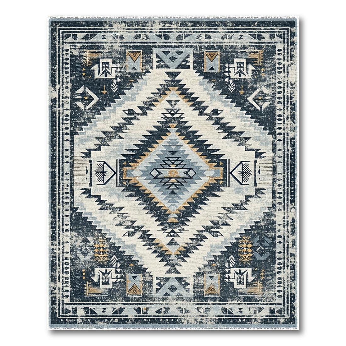 Distressed Navy Tribal Geometric Rug
