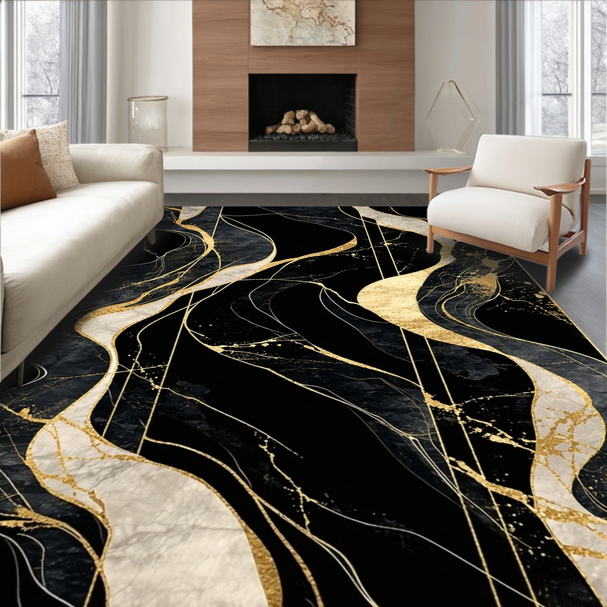 Modern Black Gold Abstract Flowing Rug
