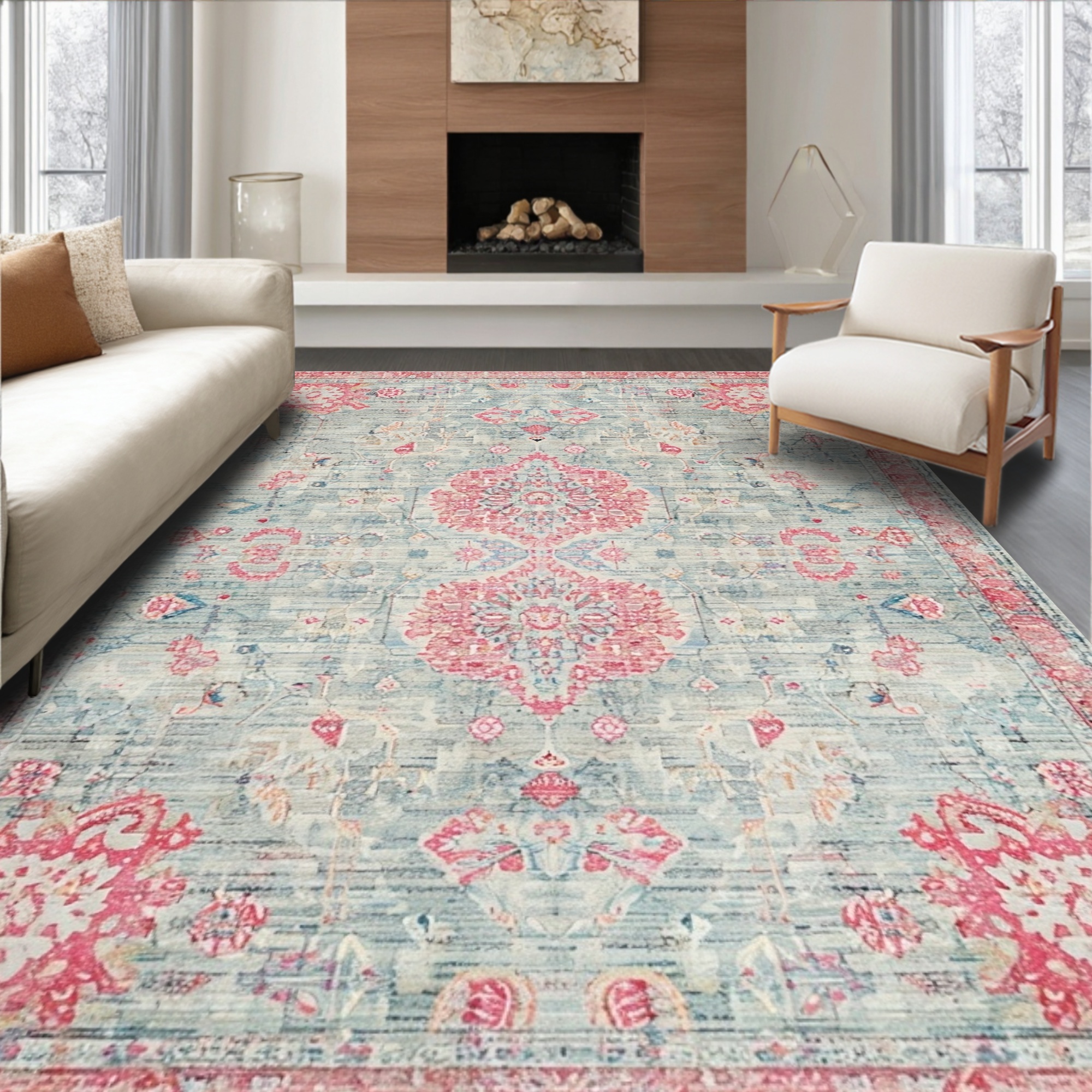 Soft Pink & Blue Medallion Pattern Rug
