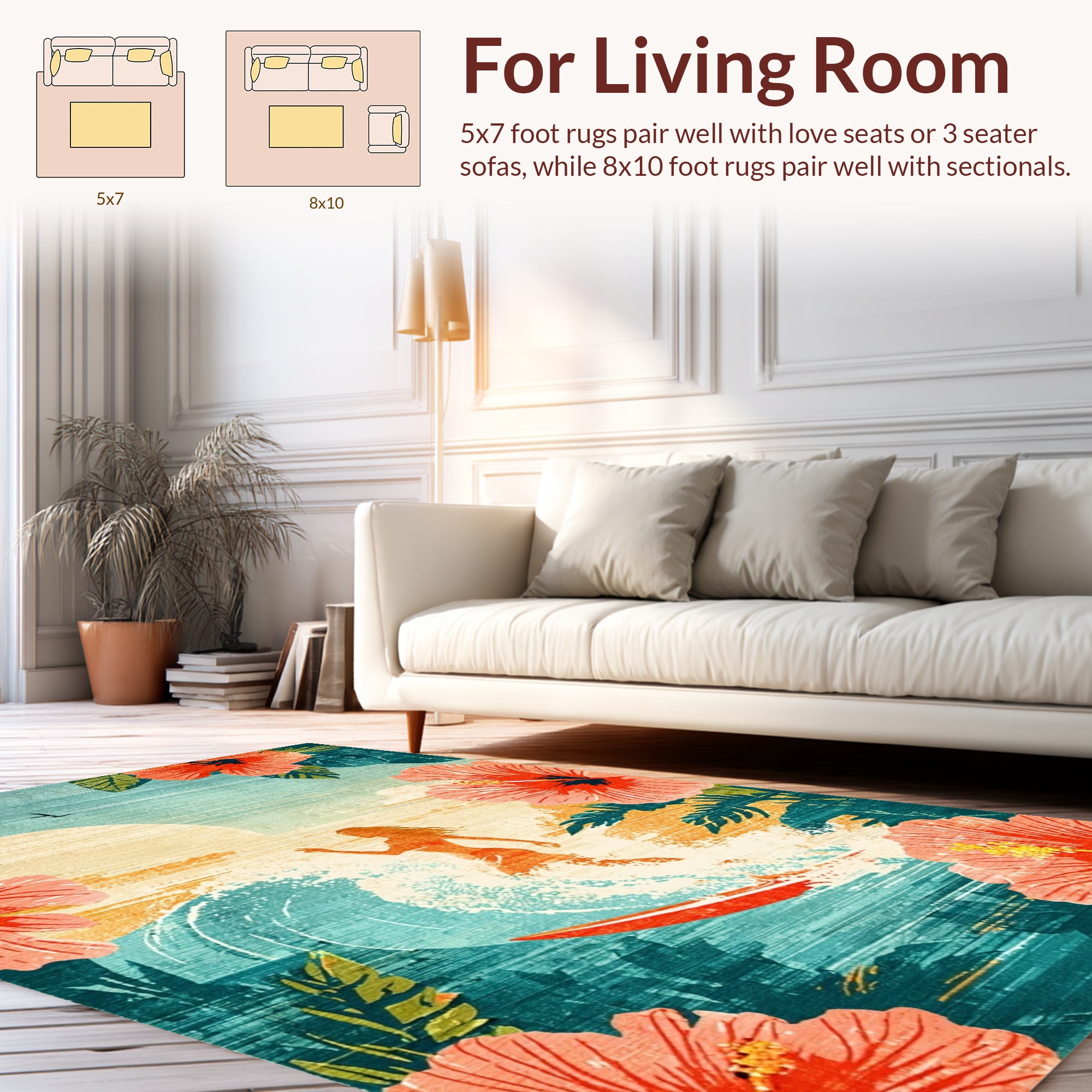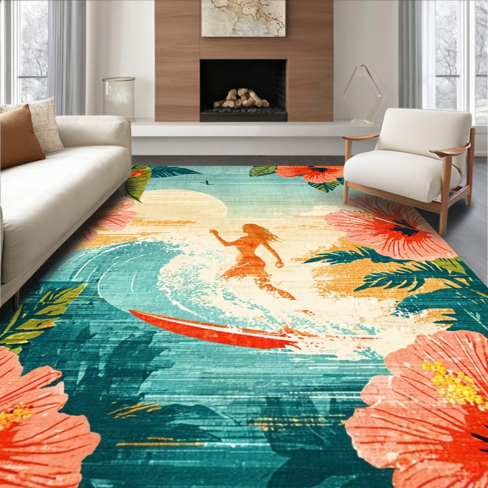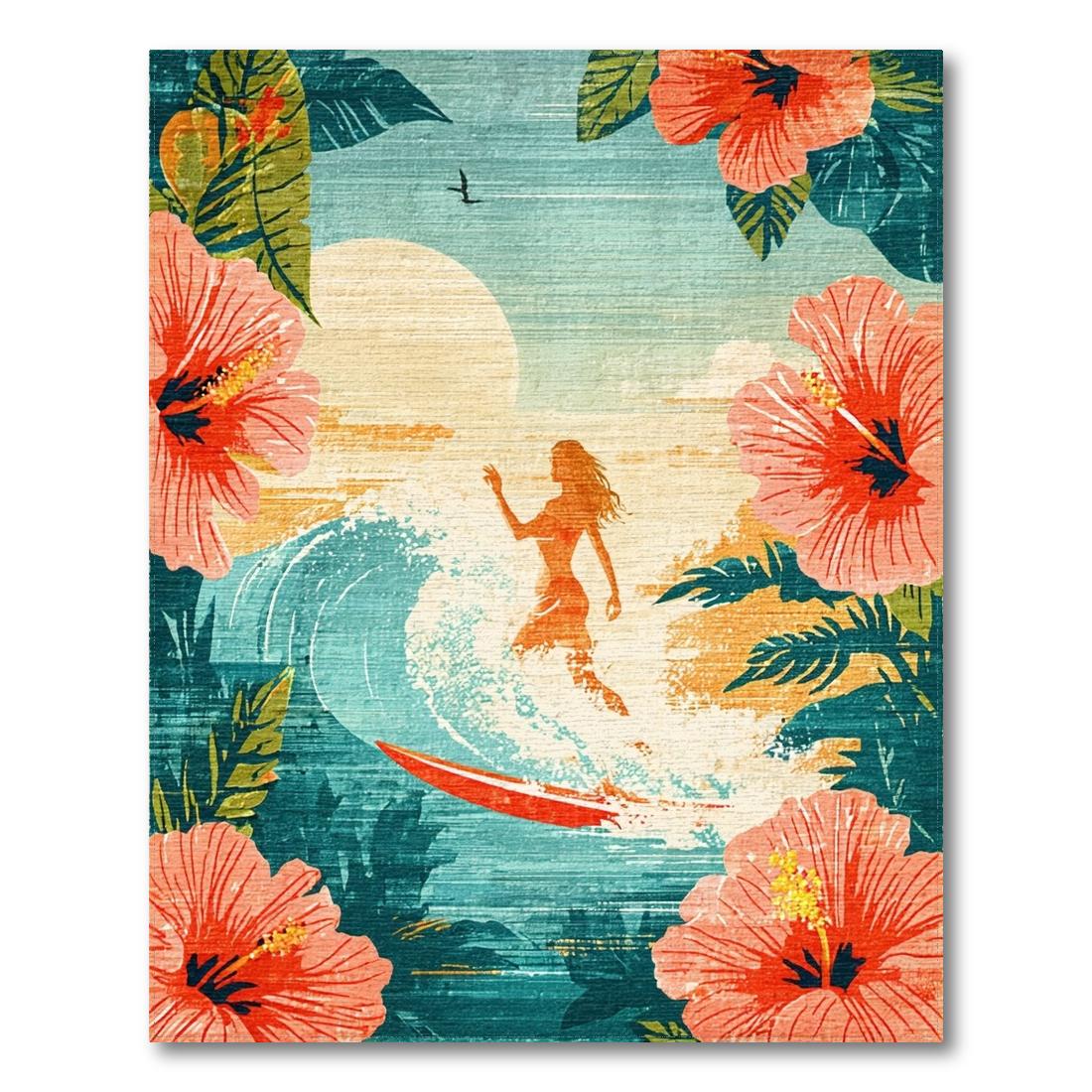 Teal Coral Tropical Hibiscus Surf Rug