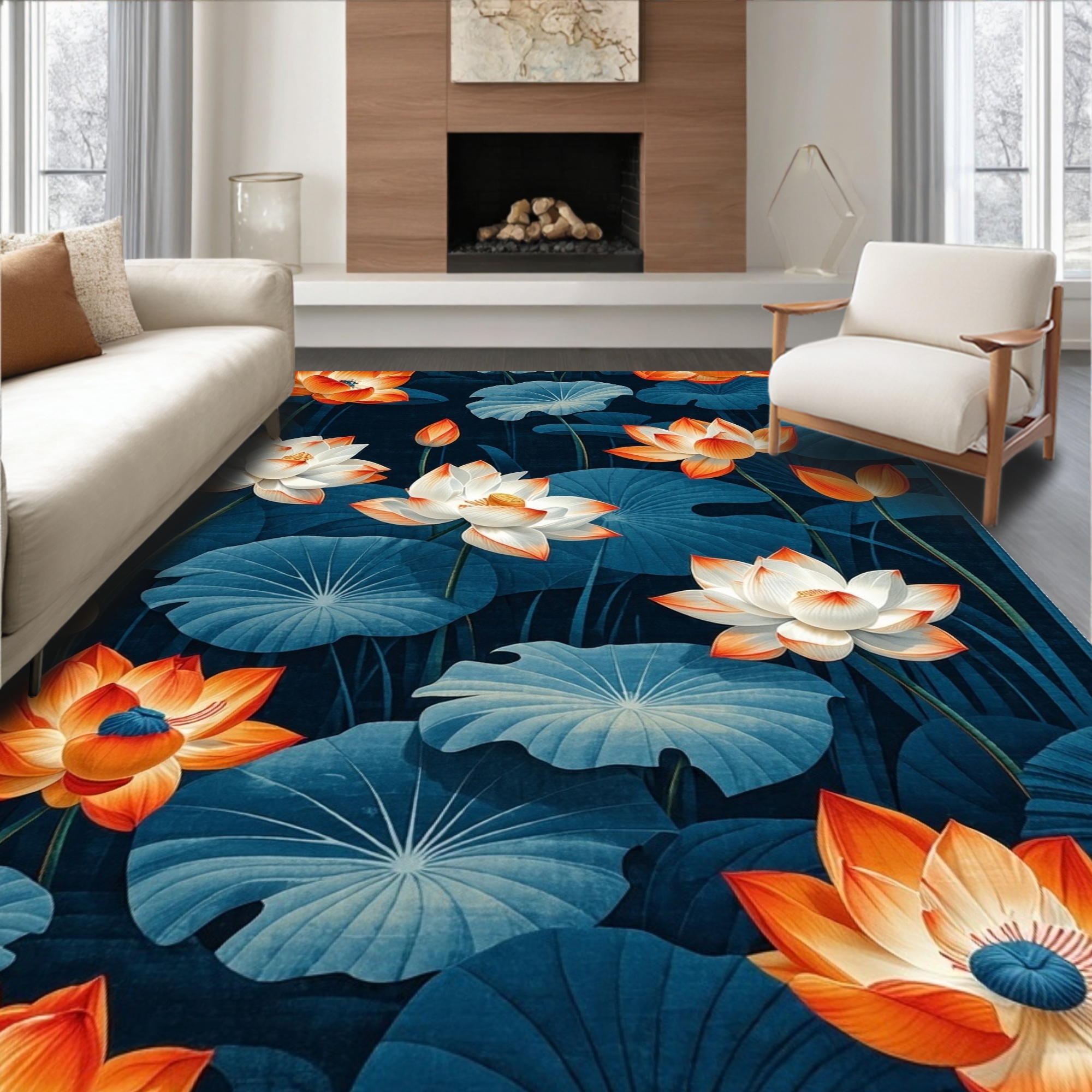 Teal Orange Lotus Floral Serene Rug